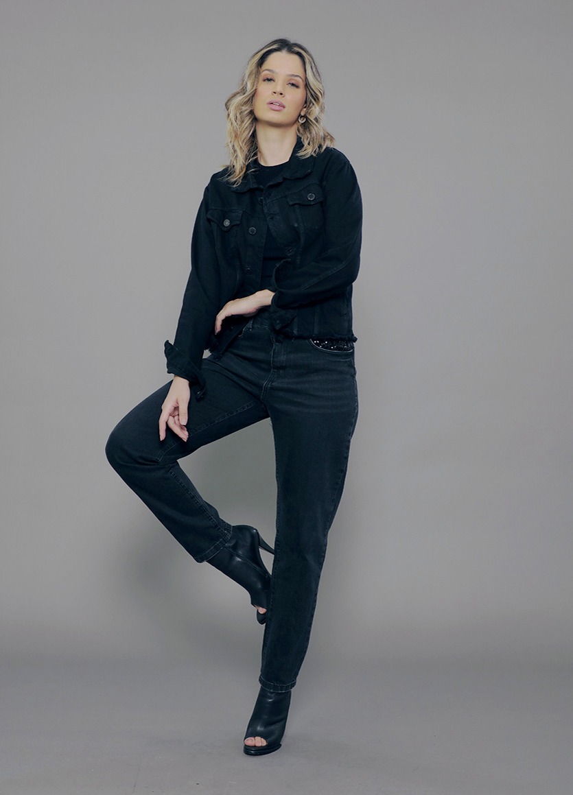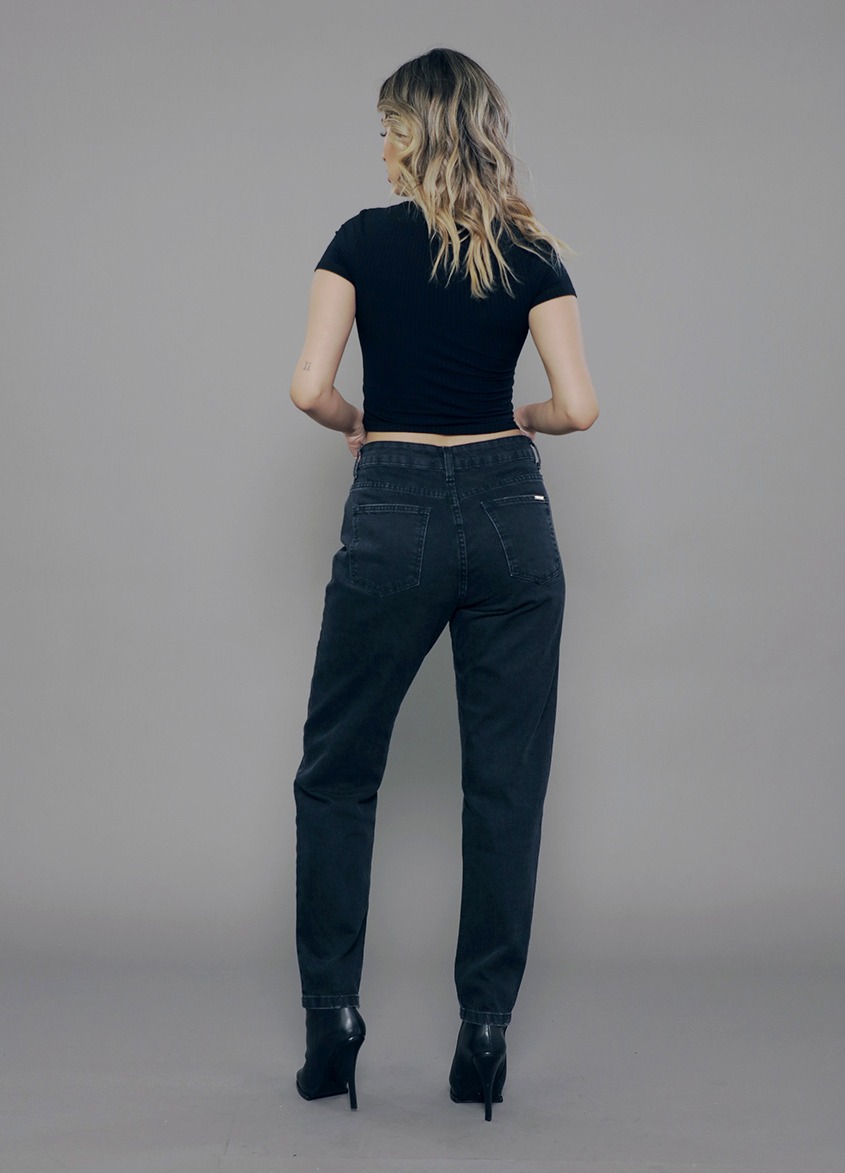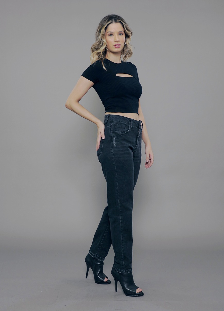 CL.163.0080 Calça Jeanswear Feminina Mom Cintura Alta Básica em Jeans Black 100% Algodão Estonado com Puídos*Tm:34 ao 48
