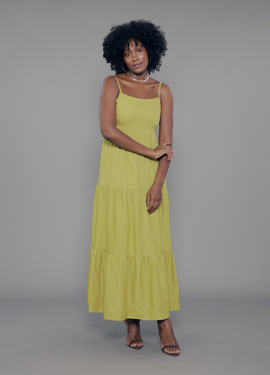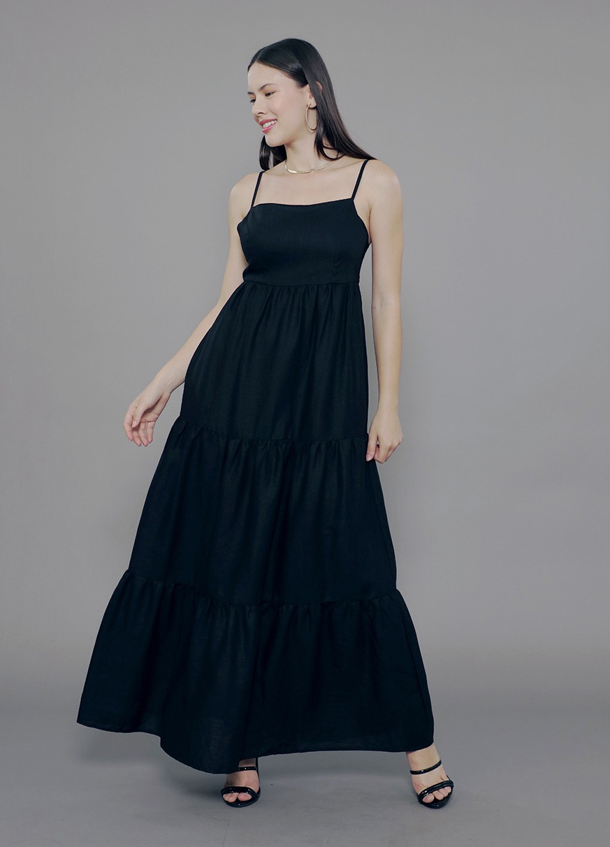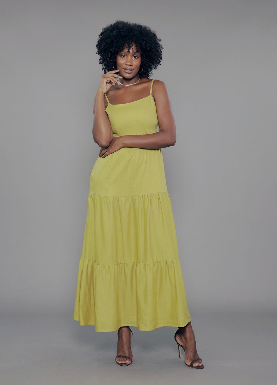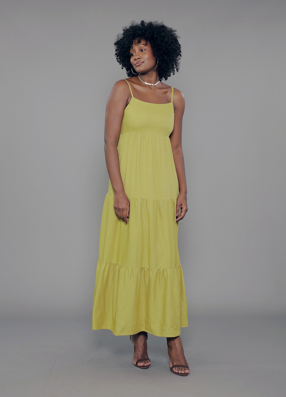 VE.163.0025 Vestido Modal Feminino Longo Alça Fina Decote Reto Com Babados em Linho Misto