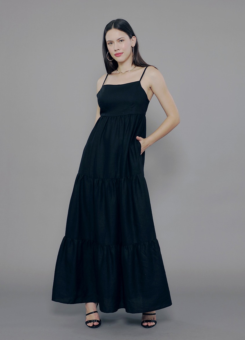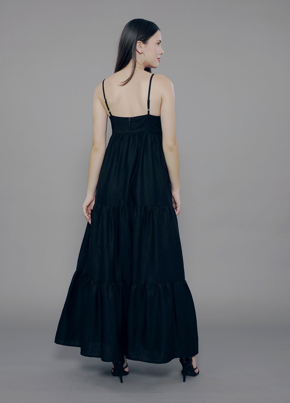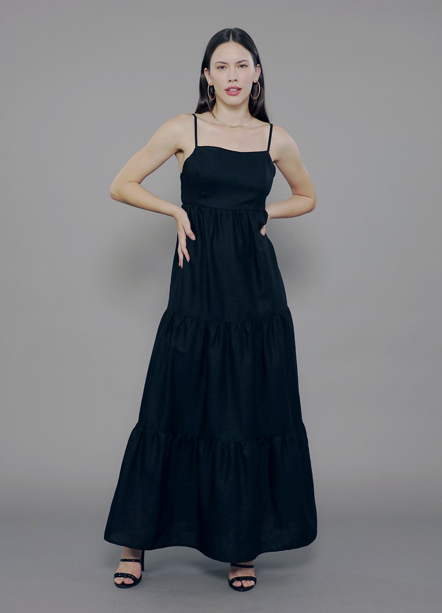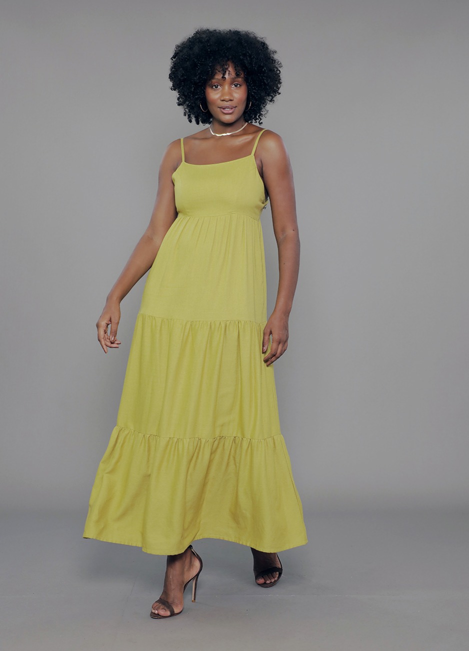 VE.163.0025 Vestido Modal Feminino Longo Alça Fina Decote Reto Com Babados em Linho Misto