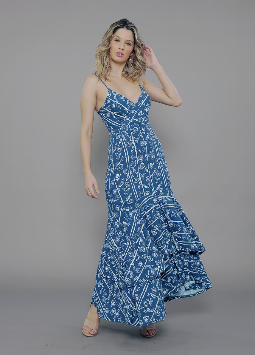 VE.163.0002 Vestido Modal Feminino Longo Alça Fina Decote V Com Babados em Viscose Mista