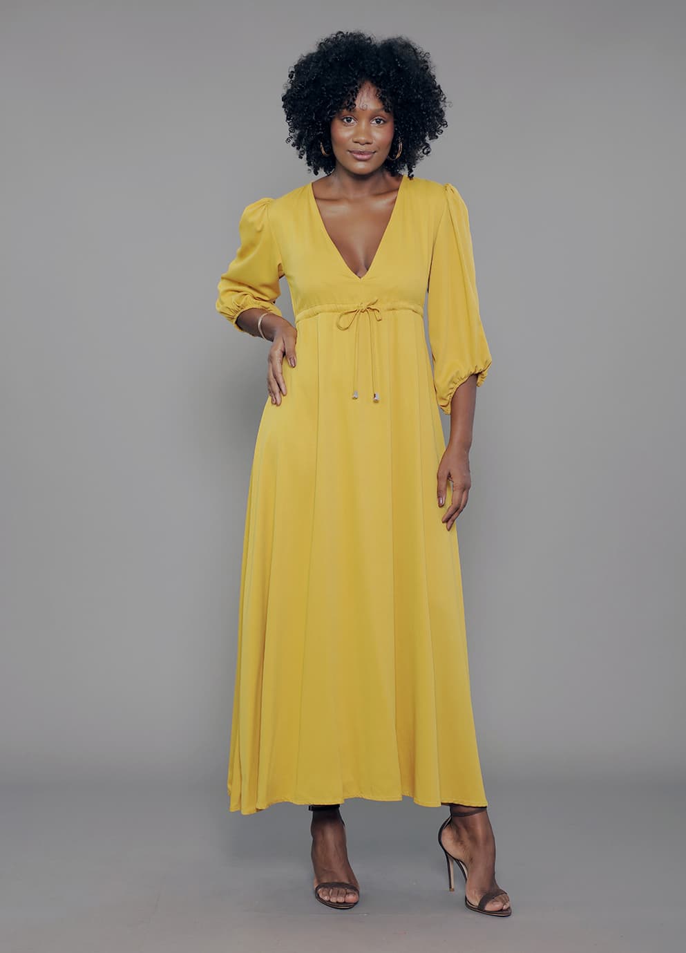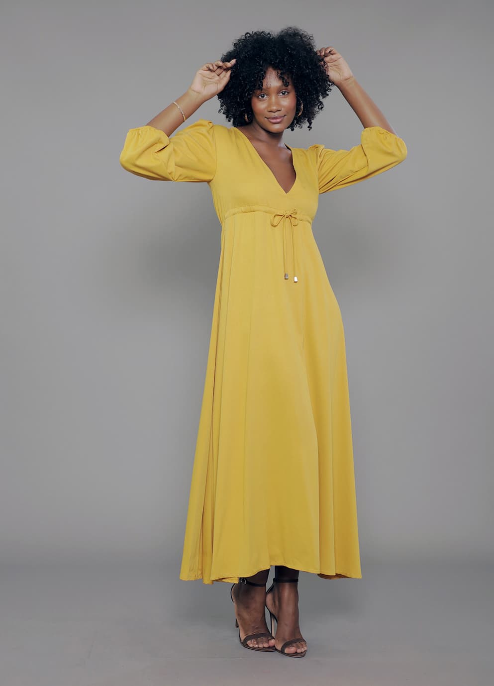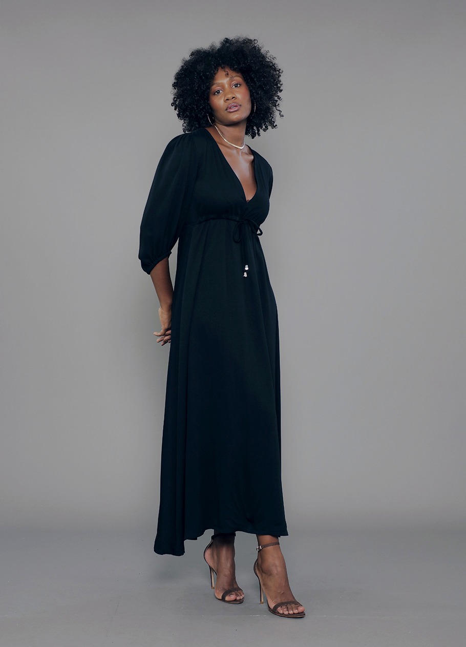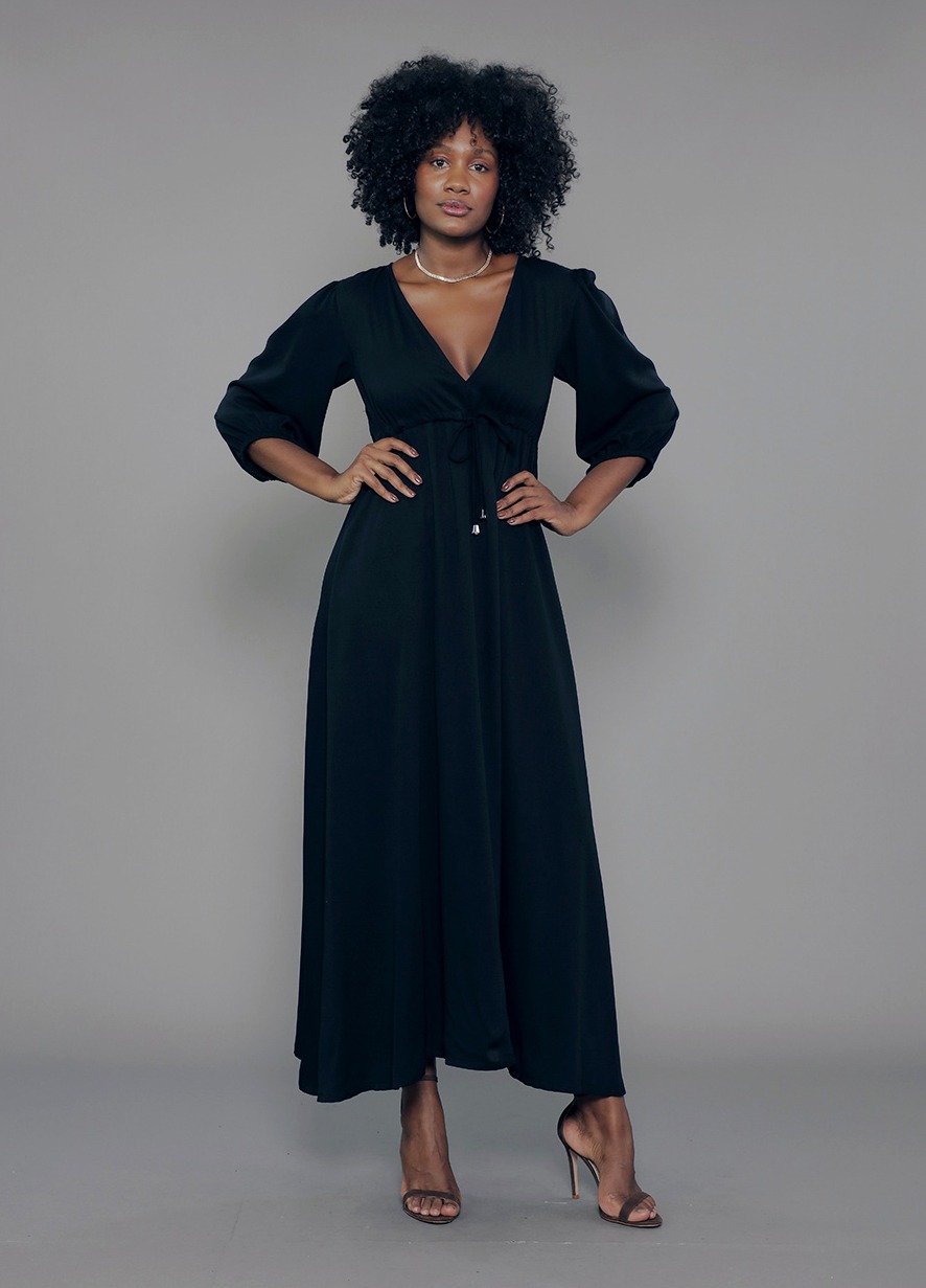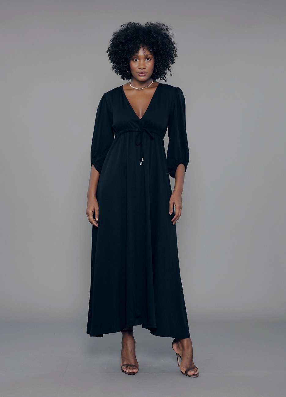 VE.163.0024 Vestido Modal Feminino Longo Manga 7/8 Decote V Com Cordão Ajustador em Viscose Mista